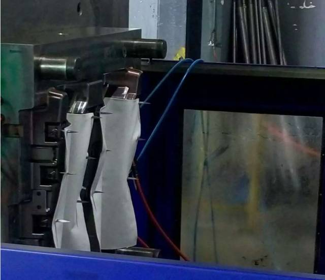 低壓注塑模具主要原理是注塑壓力較低在布上流動(dòng),開模時(shí)要先把布掛到前模掛針上,合模、注塑、然后取件。