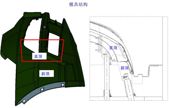 如下圖所示,產(chǎn)品兩頭采用直頂+斜頂?shù)臋C(jī)構(gòu)進(jìn)行脫模。