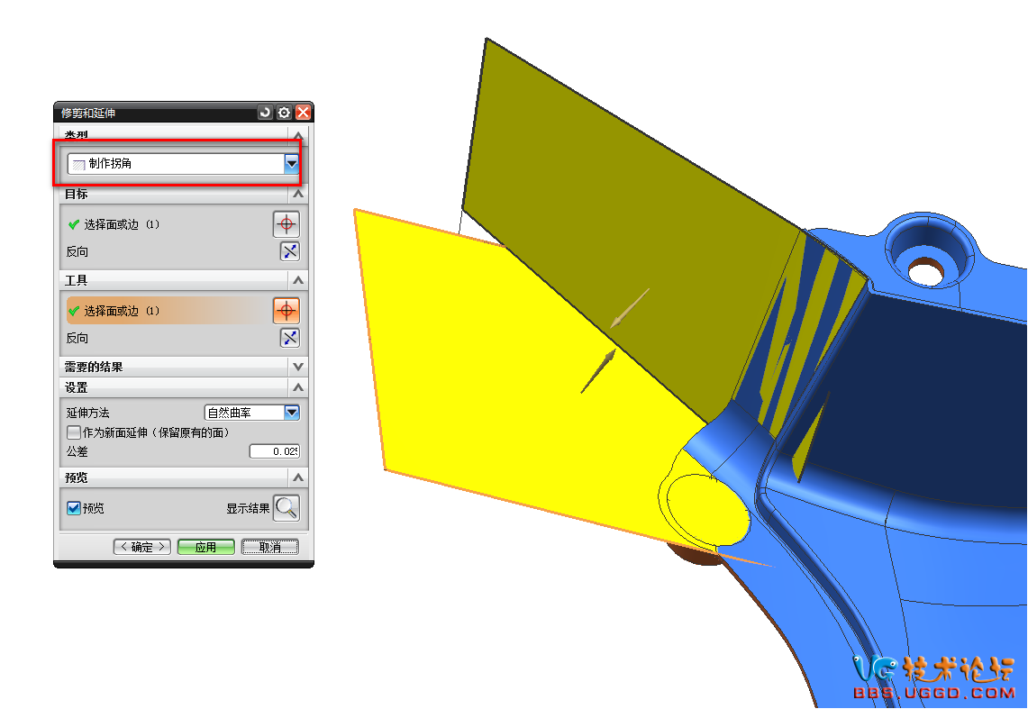 2.用“修剪和延伸”命令將兩個面創(chuàng)建拐角,注意類型選擇制作拐角,結果如圖所示